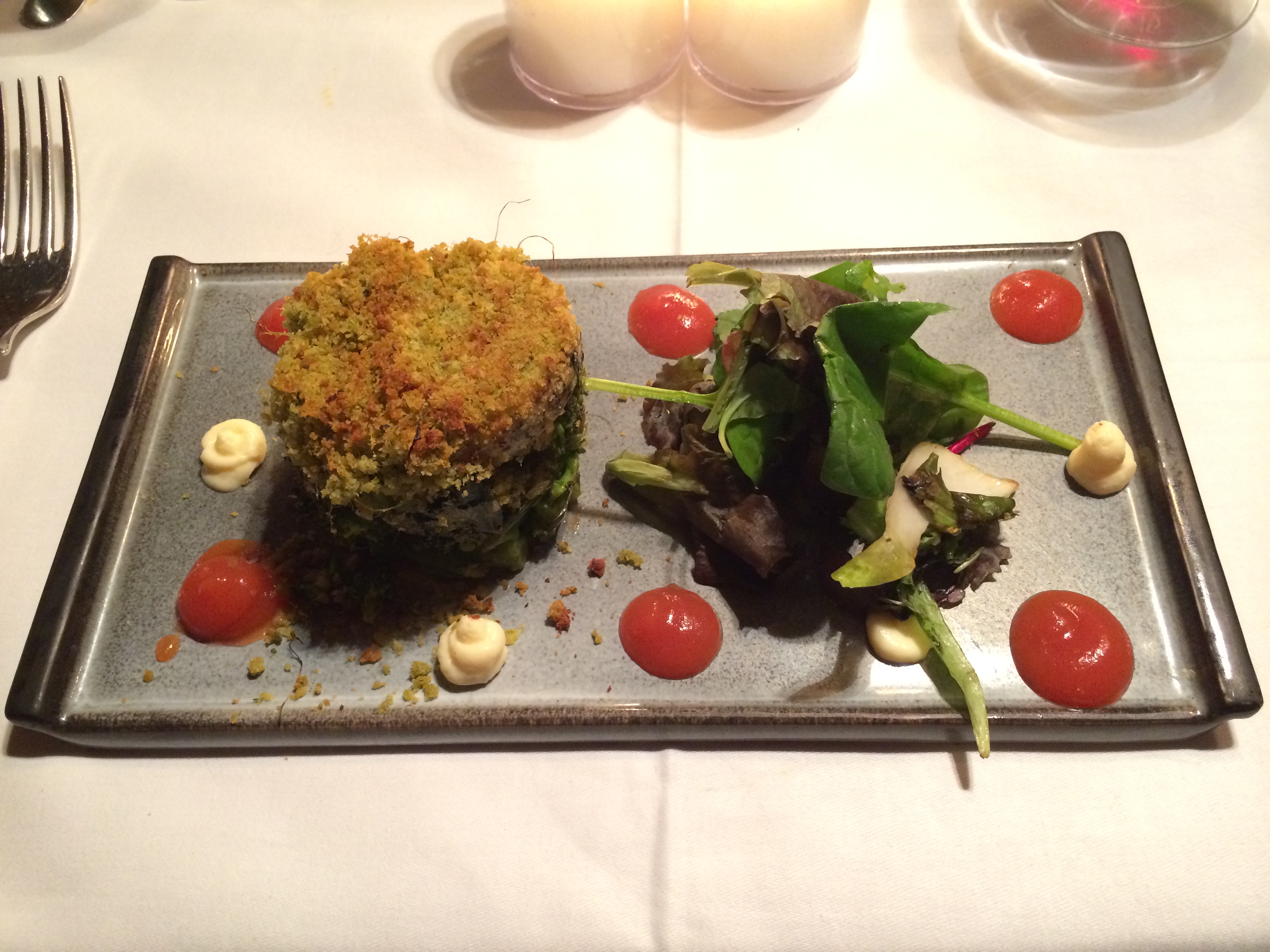 My husband’s face was a picture as our ‘Tender stem broccoli, baked goats cheese, pine nut crumble’ was served. He was horrified. I was also pretty shocked, but nobody wants to see an elephantine woman moan about portion size. The crumble – which turned out to be the approximate size of one fish cake – tasted lovely. The accompanying leaf of lettuce was refreshing.